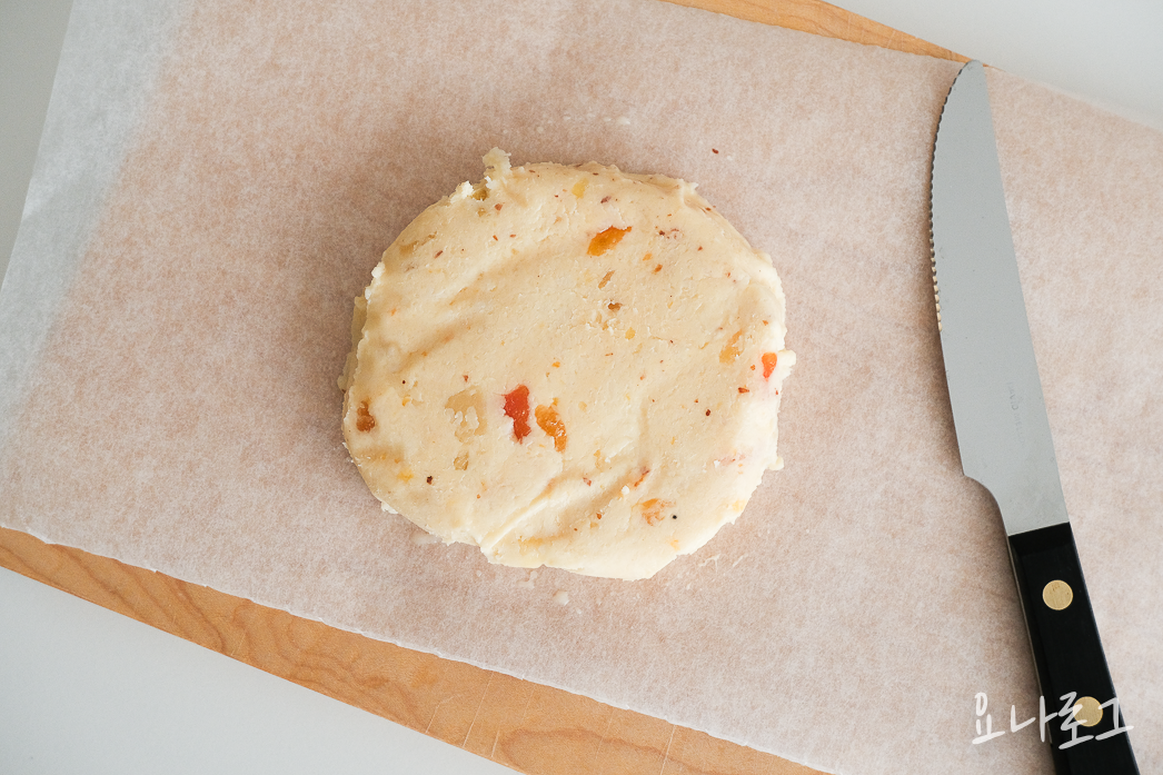 치즈나 버터 커팅할 때는 도마 위에 기름종이 깔고 커팅하면 아주 깔끔하다. 뒷처리도 편하고.